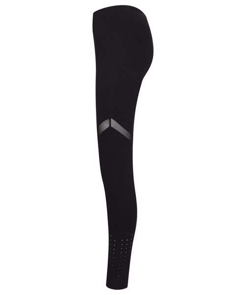 Opaque, stretch fabric. Deep waistband with inner pocket. Squat-proof. Fine mesh panels on front and back thigh. Laser cut panels at lower calves, front and back. Tombo tear-out label.
