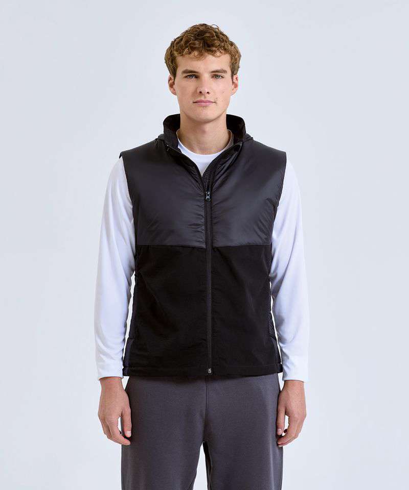 Hybrid gilet with padded panel upper chest and side seams. Lower jacket is shell fabric. Full zip-through style with collar. Drawcord inner hem. Zip side pockets. Concealed packable hood with adjustable cord and toggle to the back for to create a snug fit. Zip embroidery access to back panel and left chest. Inner pocket to left chest. Internal storm flap with zip guard. Packable bag included for handy storage of gilet when not in use. We recommend using block out vinyl and inks.Product contains no branded neck or waist label. Removable Kimble or looped garment tags. Inner seam label holds important product information on one label with a second label containing brand information which can be cut-away.