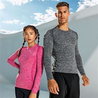 Seamless. Wicking fabric Long sleeves. Attractive embossed design. Ribbed hem and cuffs. Round collar. Stretch. Contrast stitching. We recommend using block out vinyl and inks.Product contains no branded neck or waist label. Removable Kimble or looped garment tags. Inner seam label holds important product information on one label with a second label containing brand information which can be cut-away.