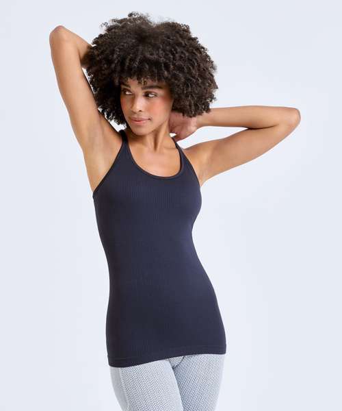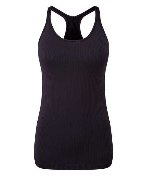 Seamless vest. Contrast detailing. Body sculpting design detailing. Racerback. Hidden sports bra inner with removable bra pads for additional support. Ribbed stretch fabric. Medium impact. We recommend using block out vinyl and inks.Product contains no branded neck or waist label. Removable Kimble or looped garment tags. Inner seam label holds important product information on one label with a second label containing brand information which can be cut-away.