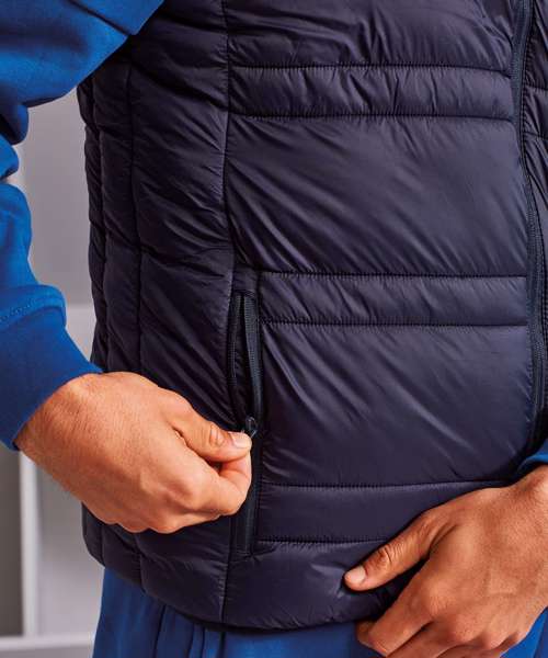 Reverse coil zip on centre front with signature zip pull. Quilted horizontal stitched wide and narrow baffles. Quilted hood with elasticate edge. Fully lined in Polyester. Elasticate armholes for a snugger fit. Internal zipped opening for embroidery access. Reverse coil zip side pockets. Internal zip pockets. Internal storm flap with chin guard. Product contains no branded neck label.* Removable Kimble or looped garment tags. Inner seam label holds important product information on one label with a second label containing brand information which can be cut-away.