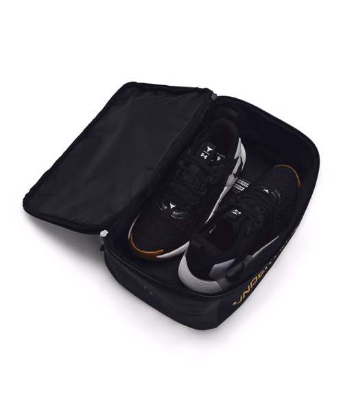 Water-repellent UA Storm technology keeps your stuff dry. Durable PU-coated material. Fits pair of shoes up to a size 14, with zip around opening for easy access. Front zip pocket. D-ring attachment point.