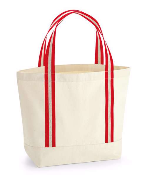 Contains 100% certified organic cotton. Premium, heavyweight fabric. Soft cotton, striped webbing handles. Can be carried by hand or over the shoulder.