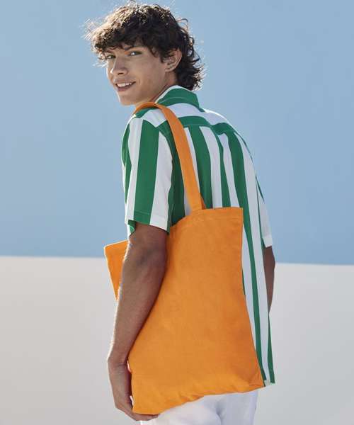 Can be carried by hand or over the shoulder. CutAway label for ease of rebranding. 100% Certified organic cotton.