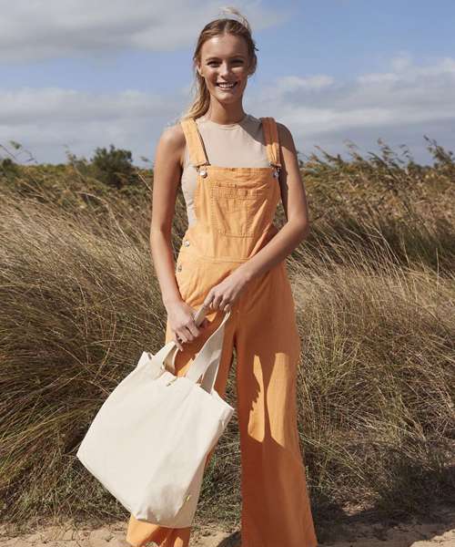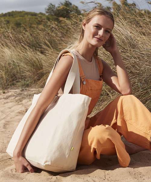 Premium heavyweight fabric. Natural wooden toggle closure. Cotton webbing carry handles. Can be carried by hand or over the shoulder. Handle length: 60cm. 100% Certified organic cotton.