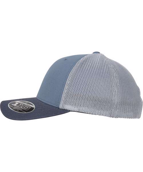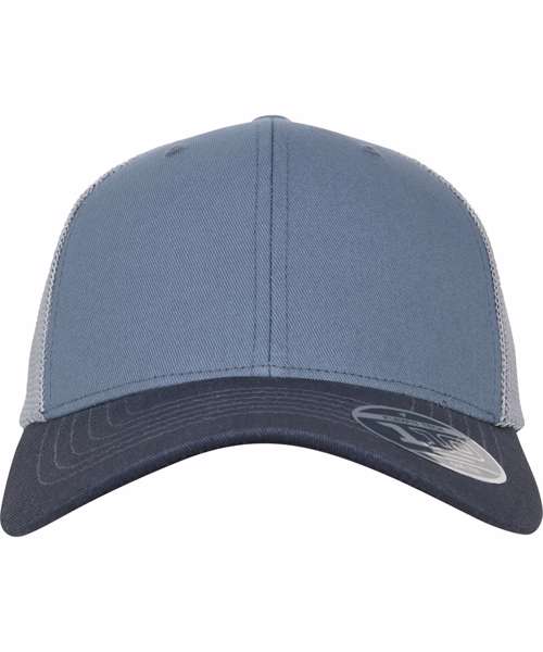 3-colour trucker cap. Sturdy cotton at front. Traditional mesh at back. Slightly pre-curved visor with decorative stitching. Snapback closure.