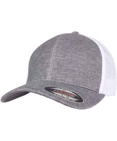 Retro trucker melange cap. Flexfit technology. Trucker mesh and a front made of very soft, slightly brushed fabric. Beautiful melange look.